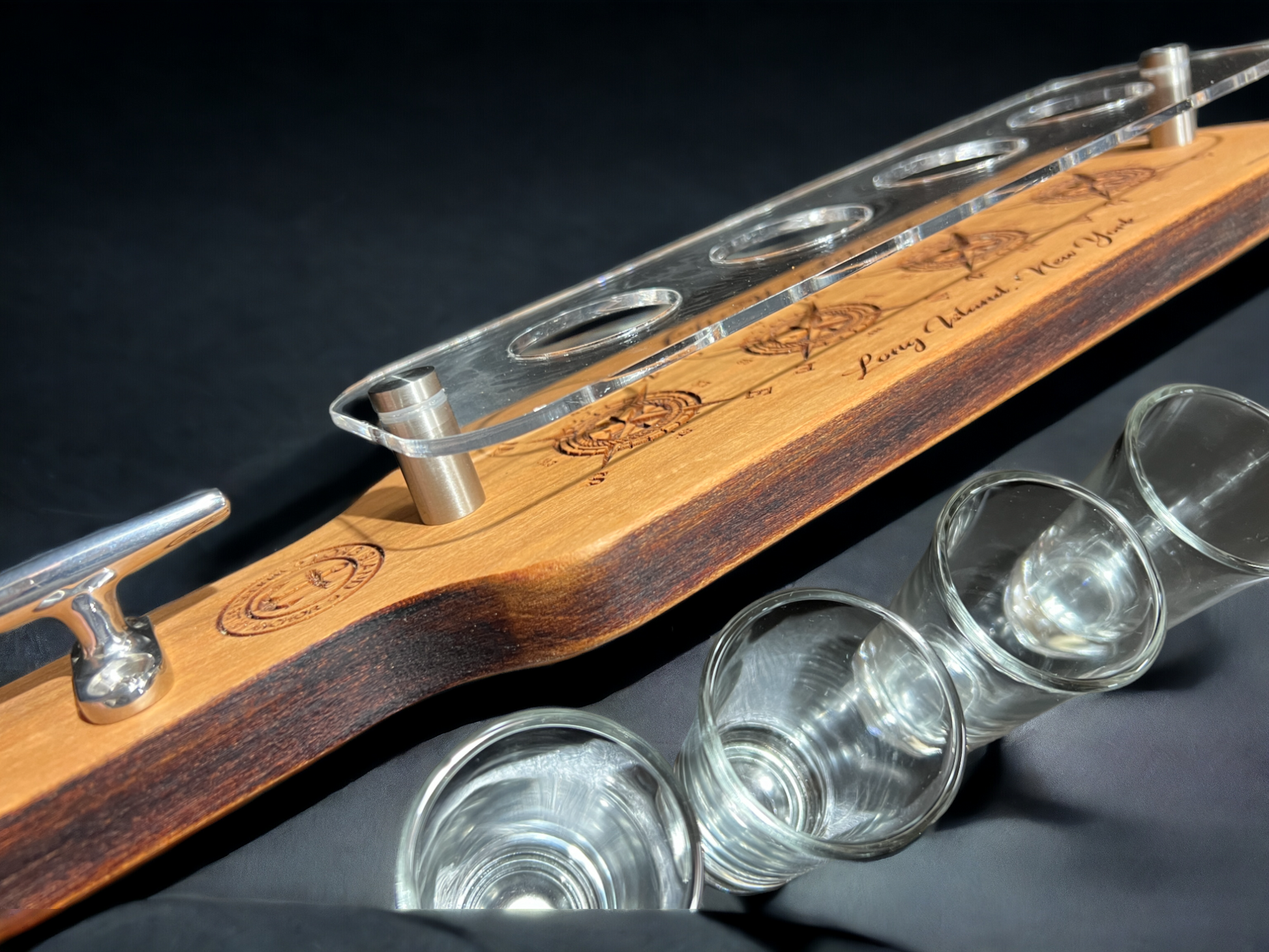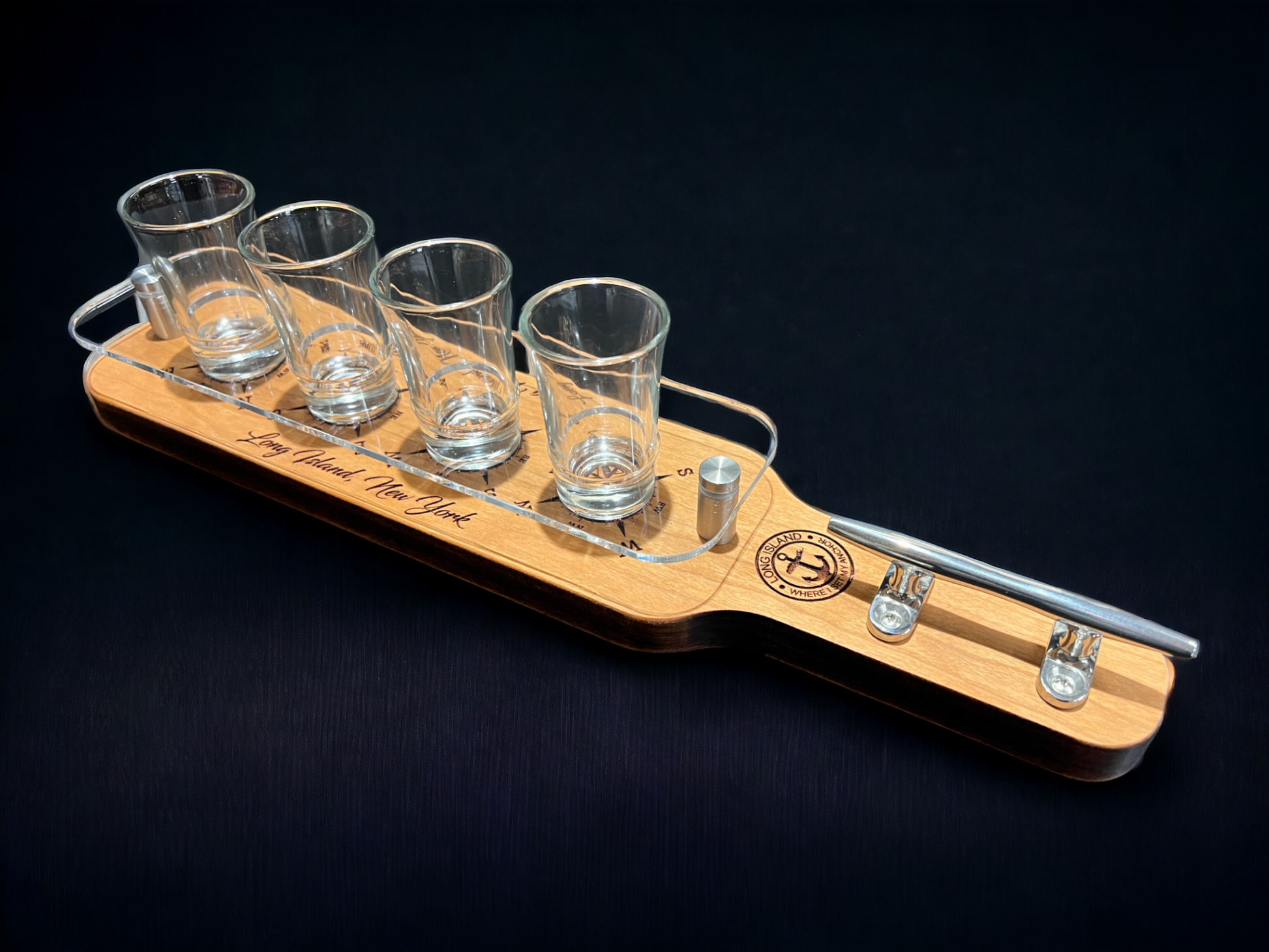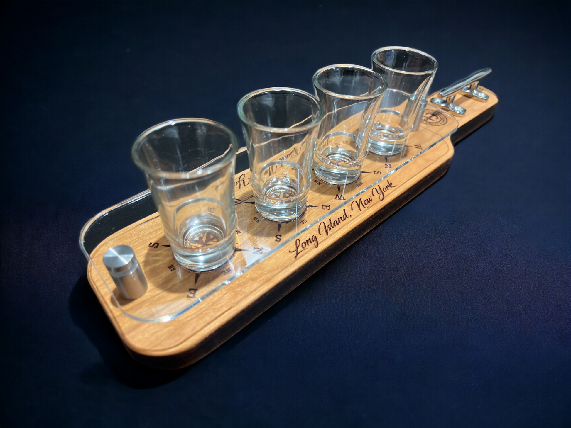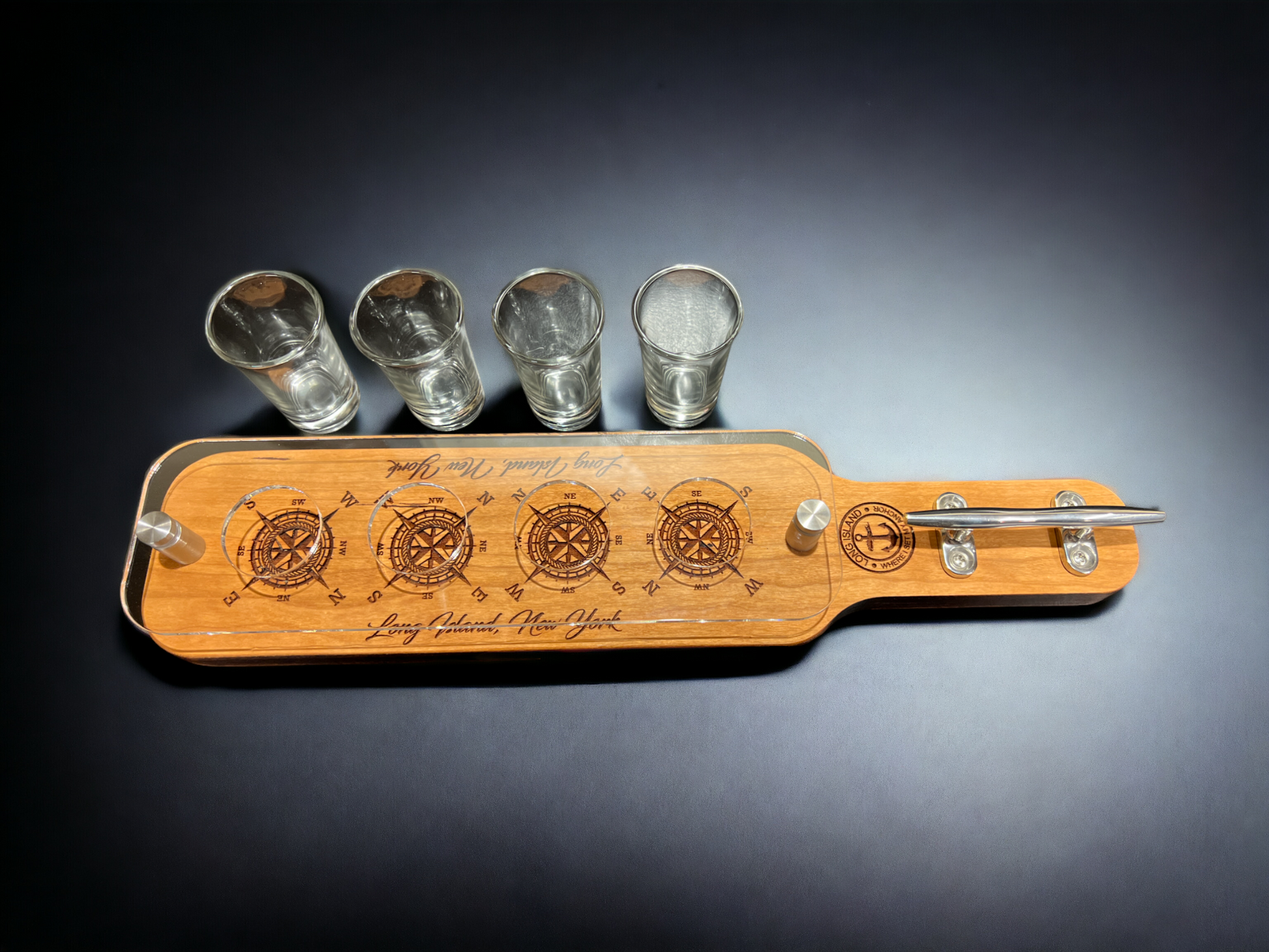 Show your love for Long Island with this Nautically inspired American Cherry and acrylic drop-in shot flight. Features (4) shot glasses, a stainless steel cleat handle and stainless steel standoffs holding 1/8" thick laser cut acrylic. The engraved nautical stars are centered perfectly underneath each shot glass and our signature "Long Island - Where I Set My Anchor" logo is placed just forward of the handle. Approximately 16" long x 4" wide. FREE SHIPPING