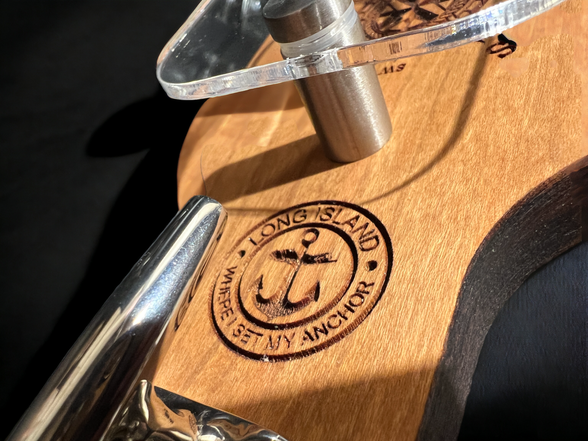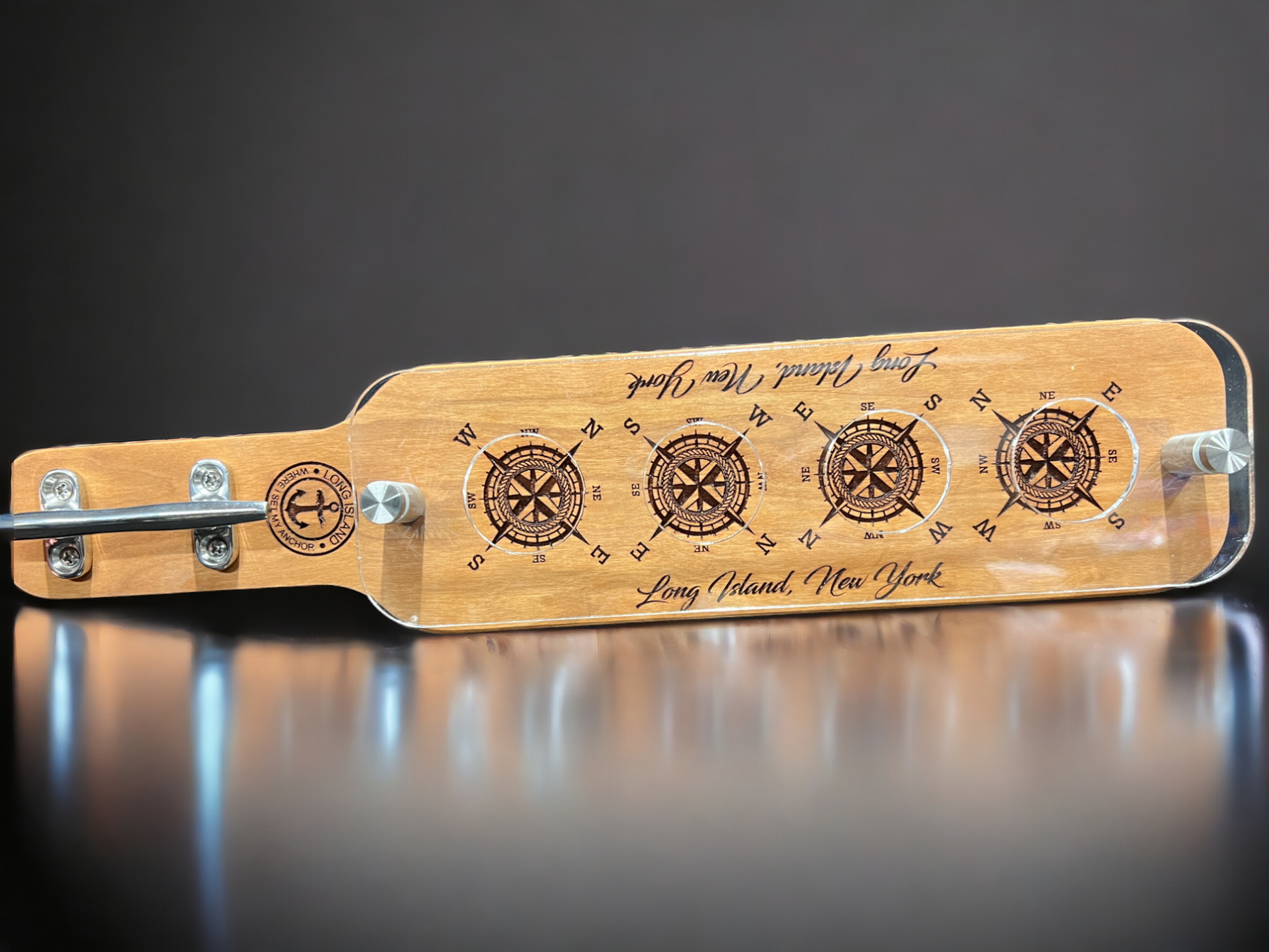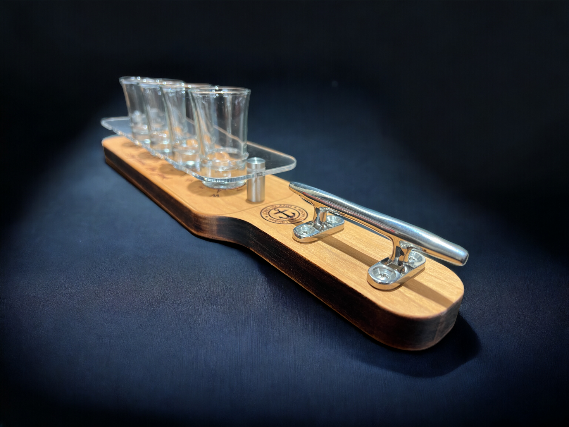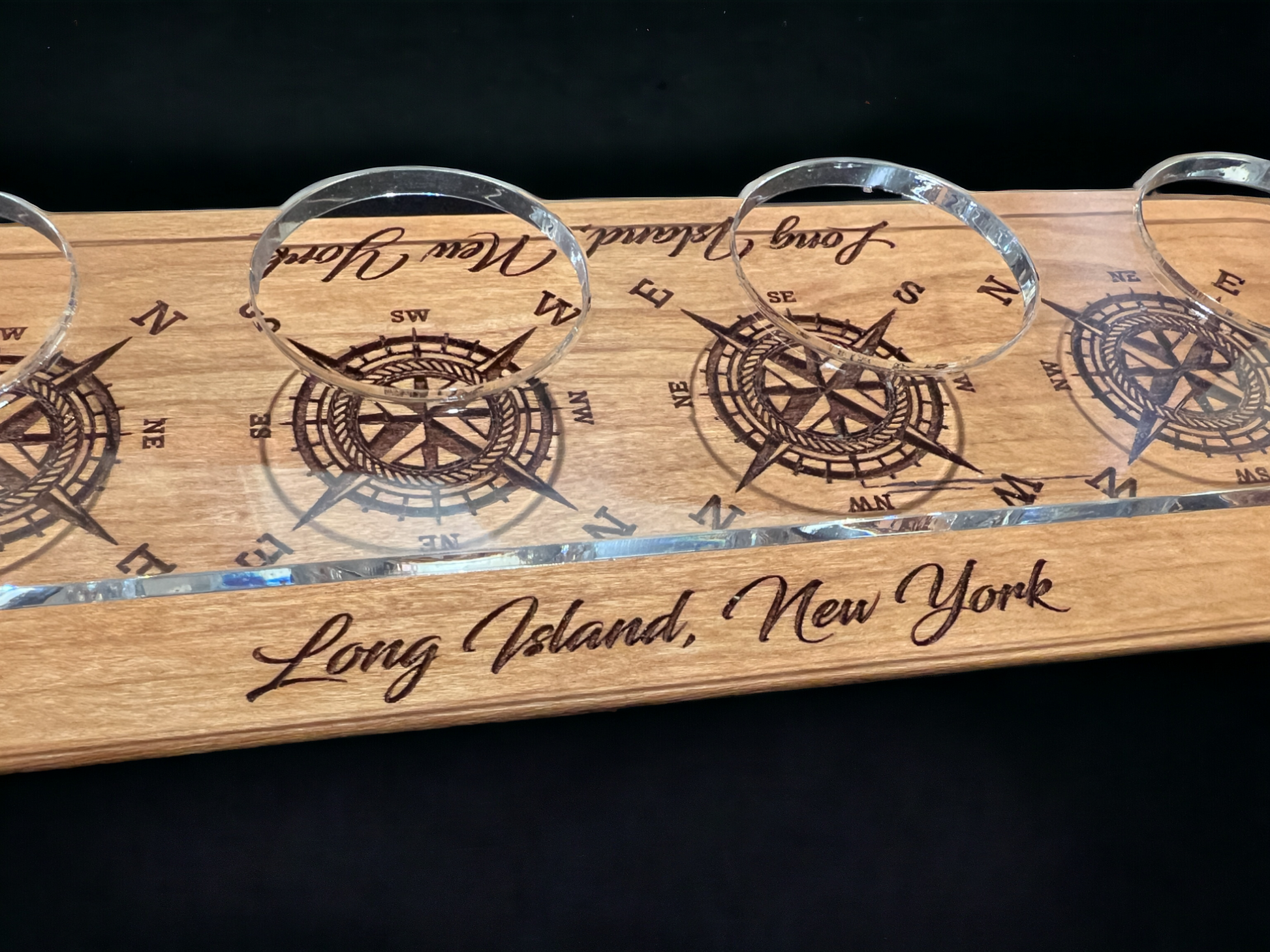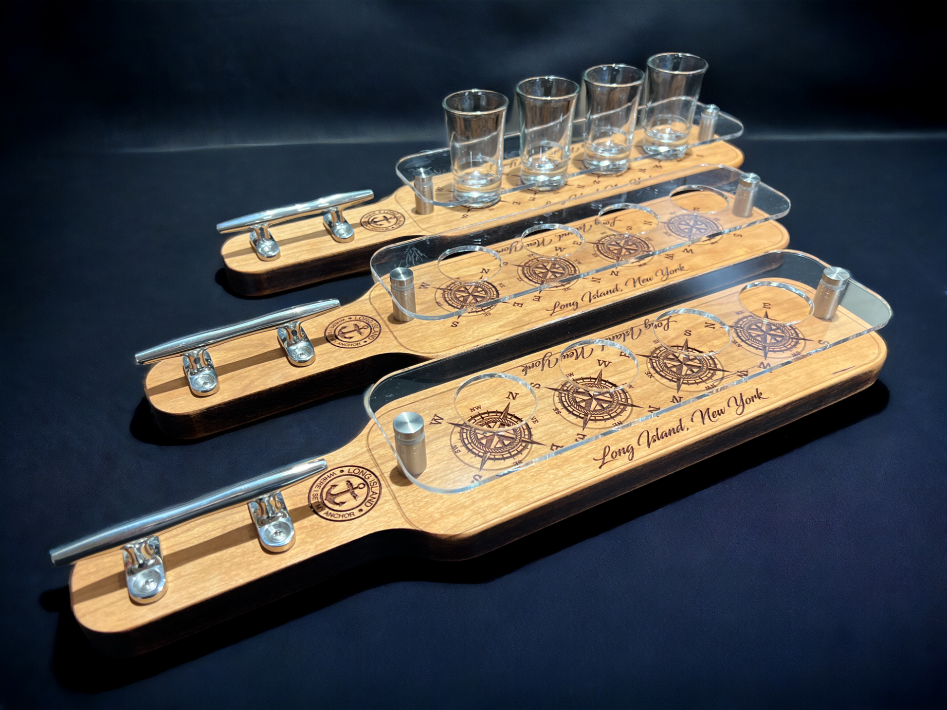 Show your love for Long Island with this Nautically inspired American Cherry and acrylic drop-in shot flight. Features (4) shot glasses, a stainless steel cleat handle and stainless steel standoffs holding 1/8" thick laser cut acrylic. The engraved nautical stars are centered perfectly underneath each shot glass and our signature "Long Island - Where I Set My Anchor" logo is placed just forward of the handle. Approximately 16" long x 4" wide. FREE SHIPPING