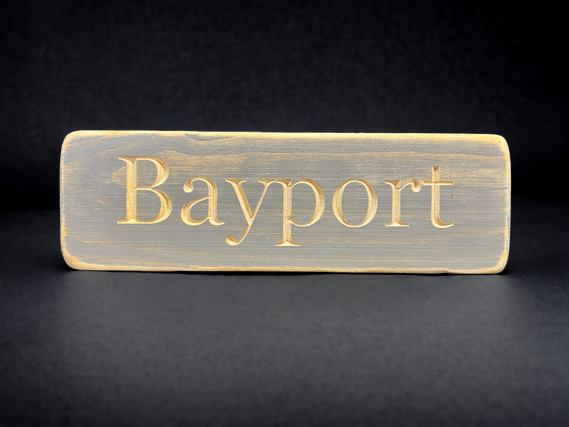 Carved Bayport distressed wood sign. Includes sawtooth hanger on back. FREE SHIPPING