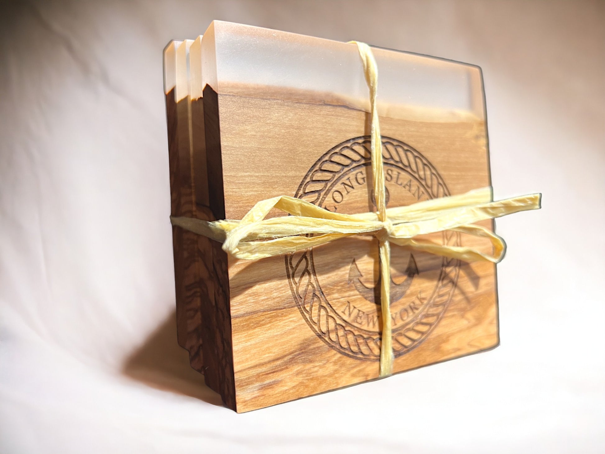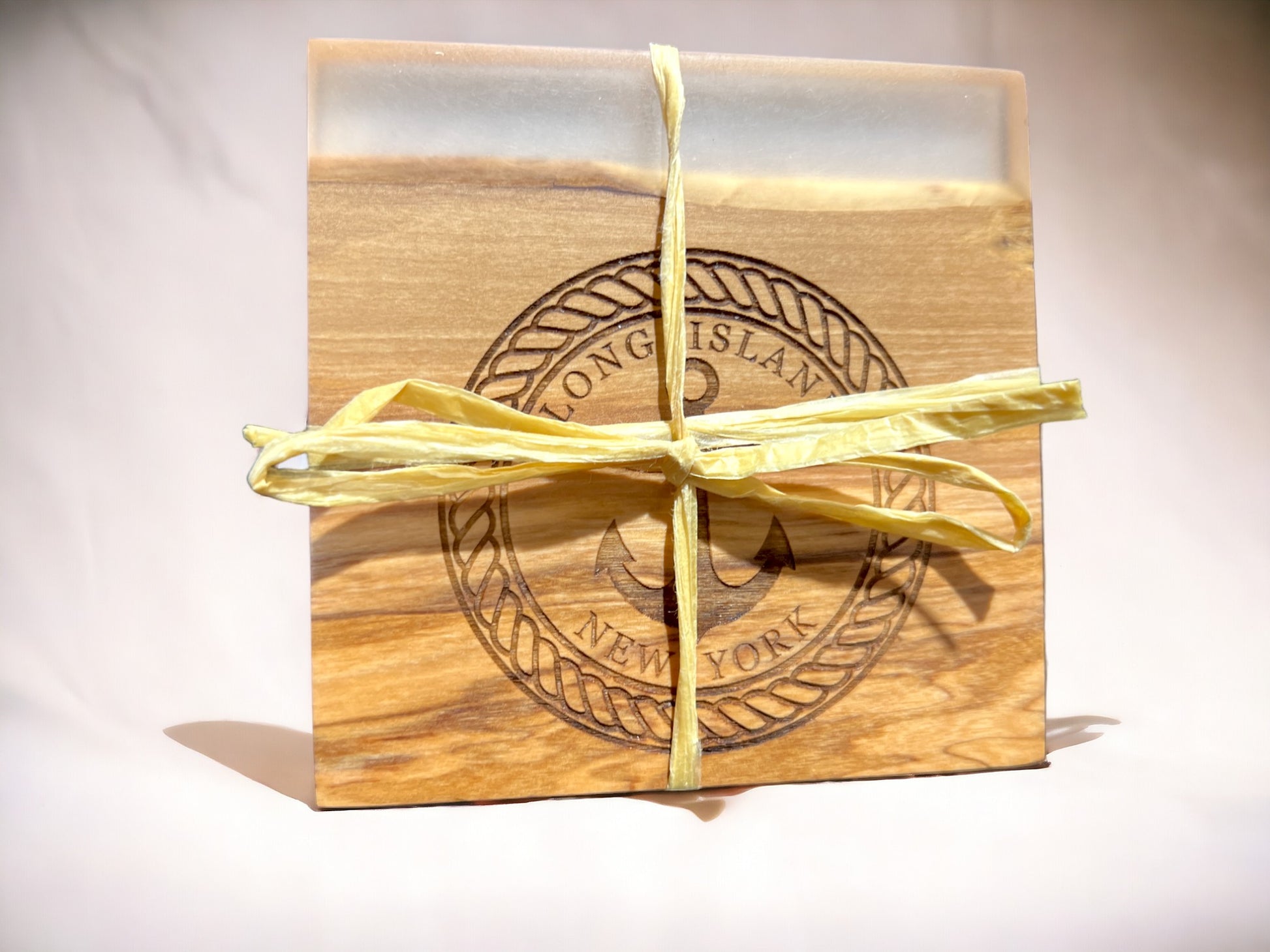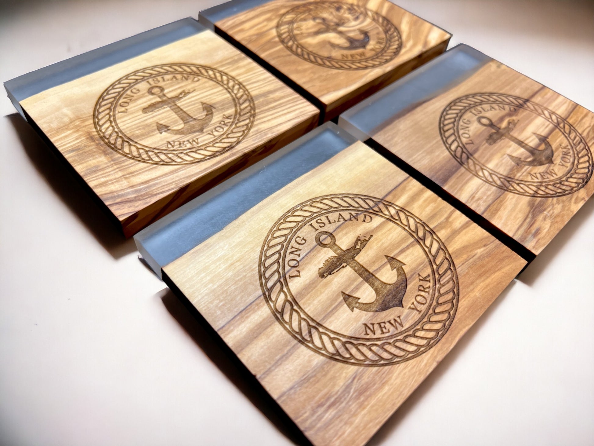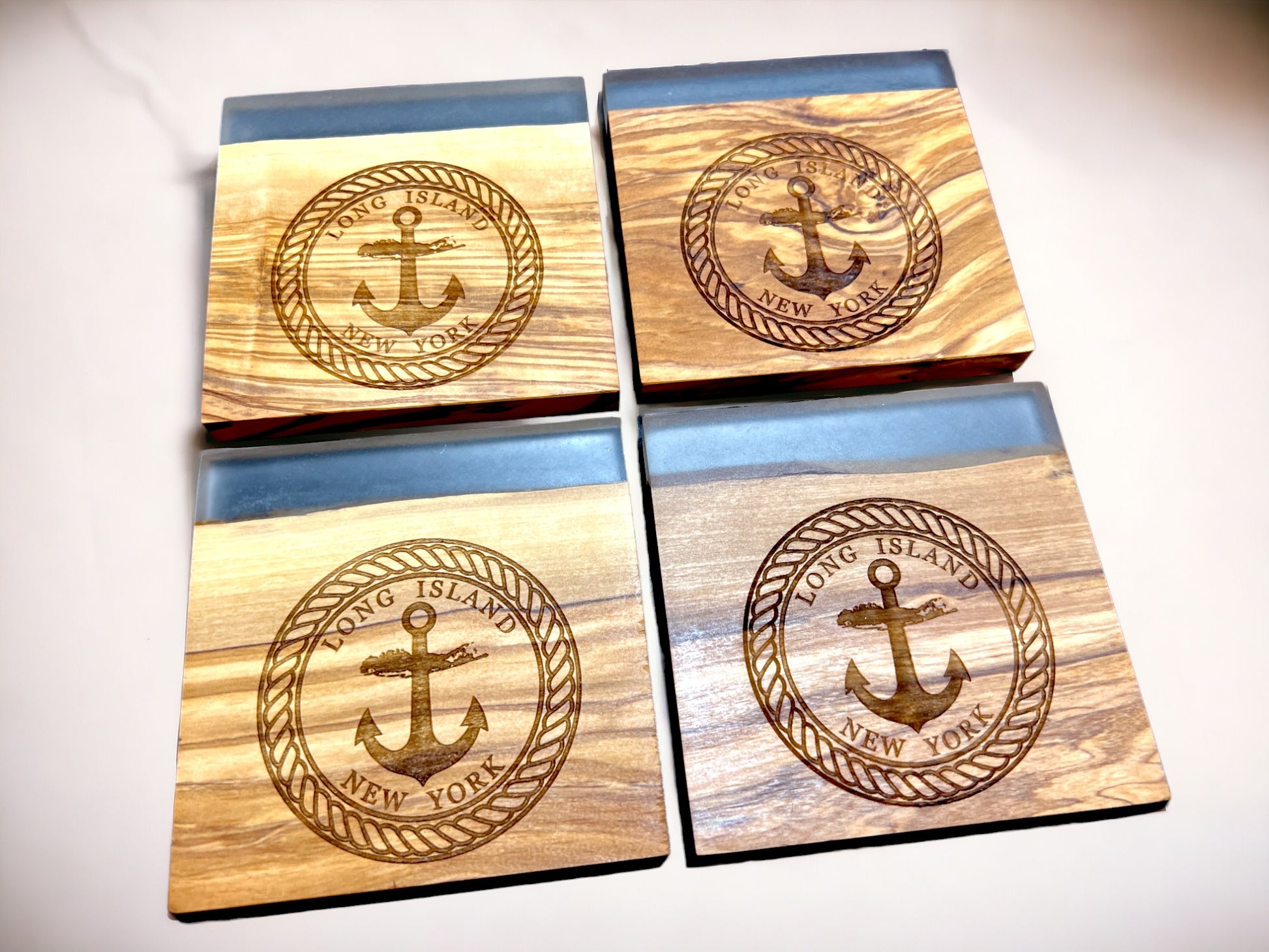 These nautical olive wood coasters have an edge of clear resin and a laser engraved Long Island New York w/Long Island Anchor logo . The contrast between the natural coloring of olive wood and the resin makes this coaster set really striking. Through the resin you can see the stunning natural edge of the olive wood. Each coaster is unique, making this set of 4 coasters a great, unusual gift. FREE SHIPPING