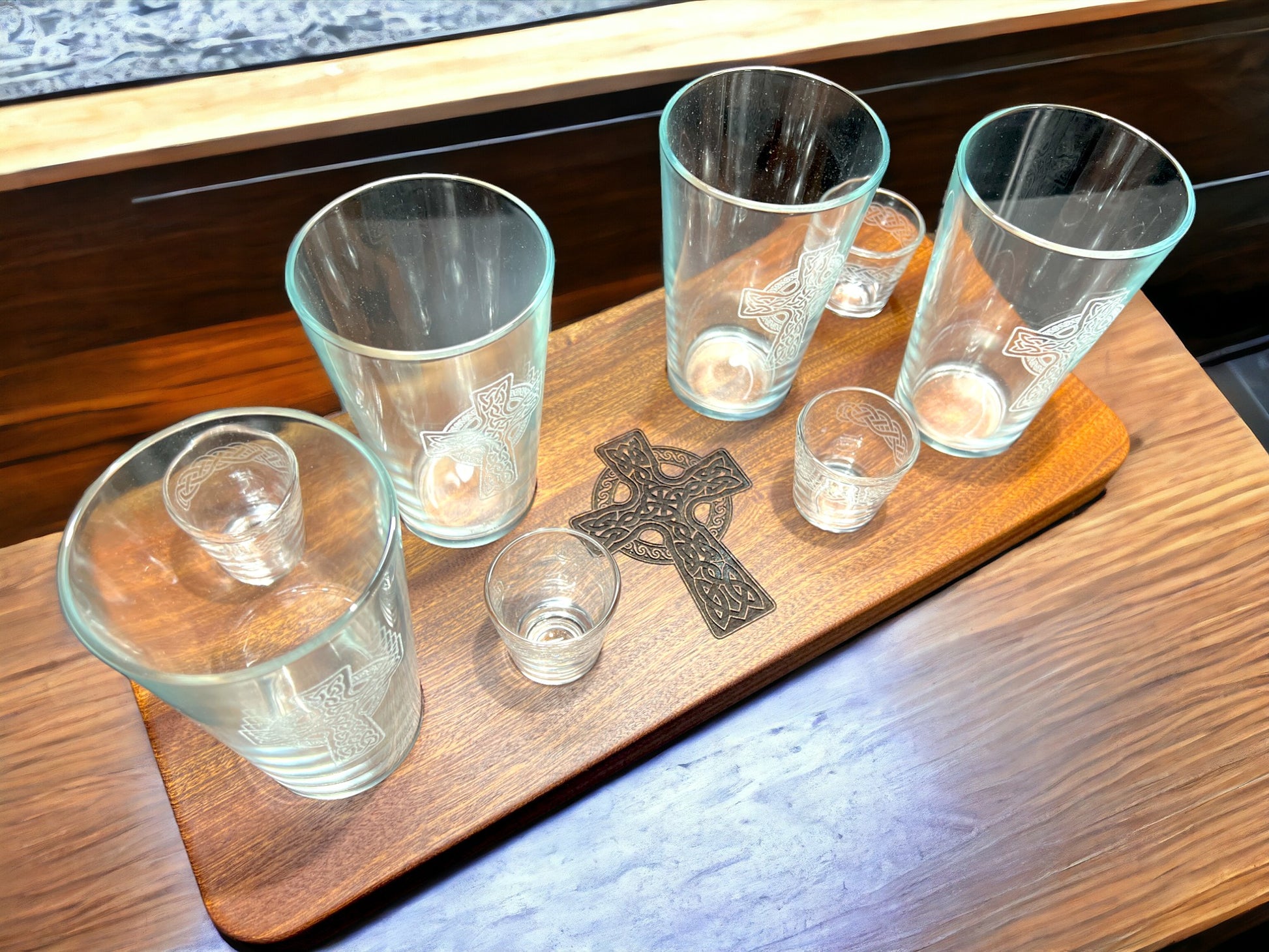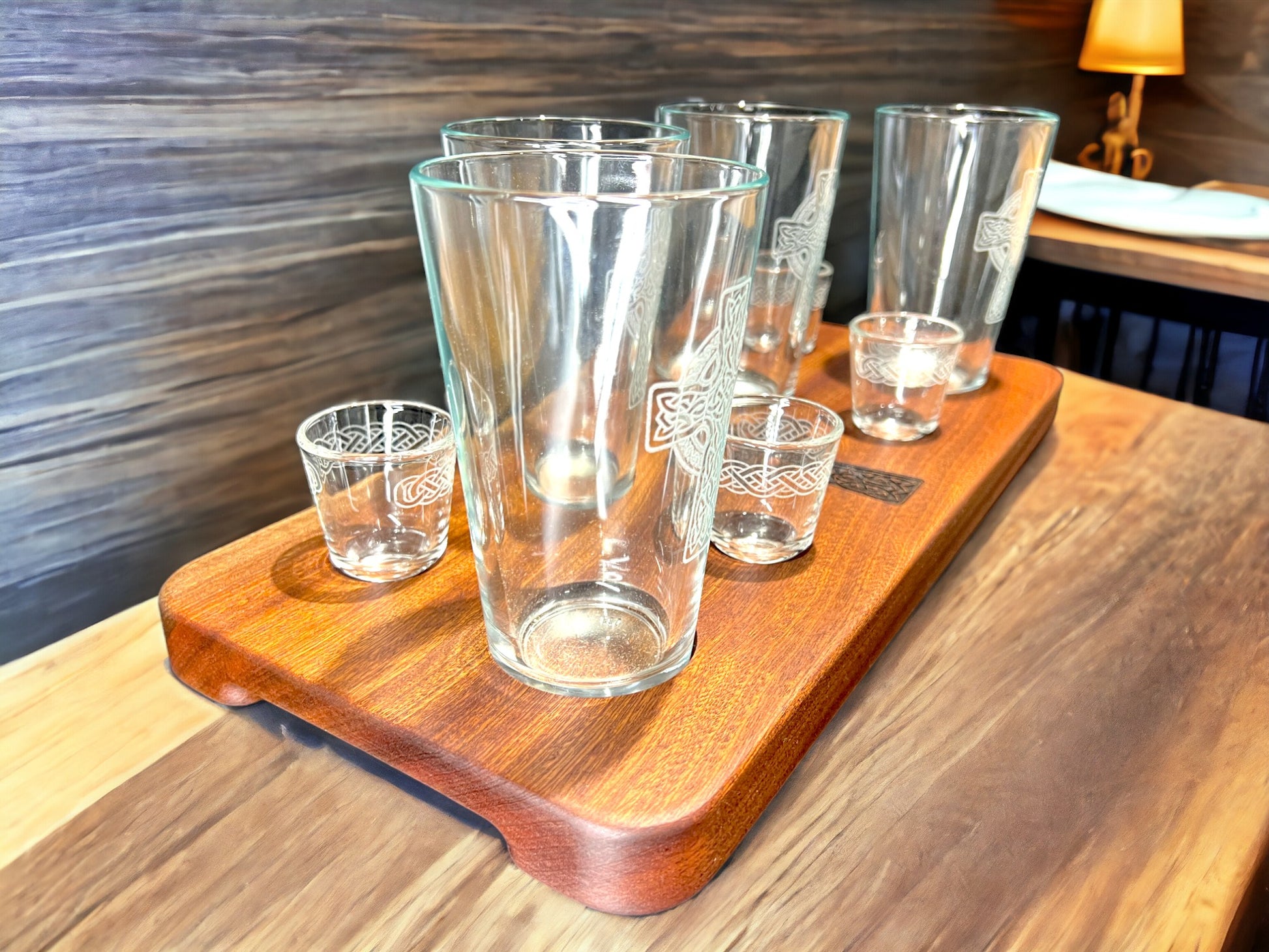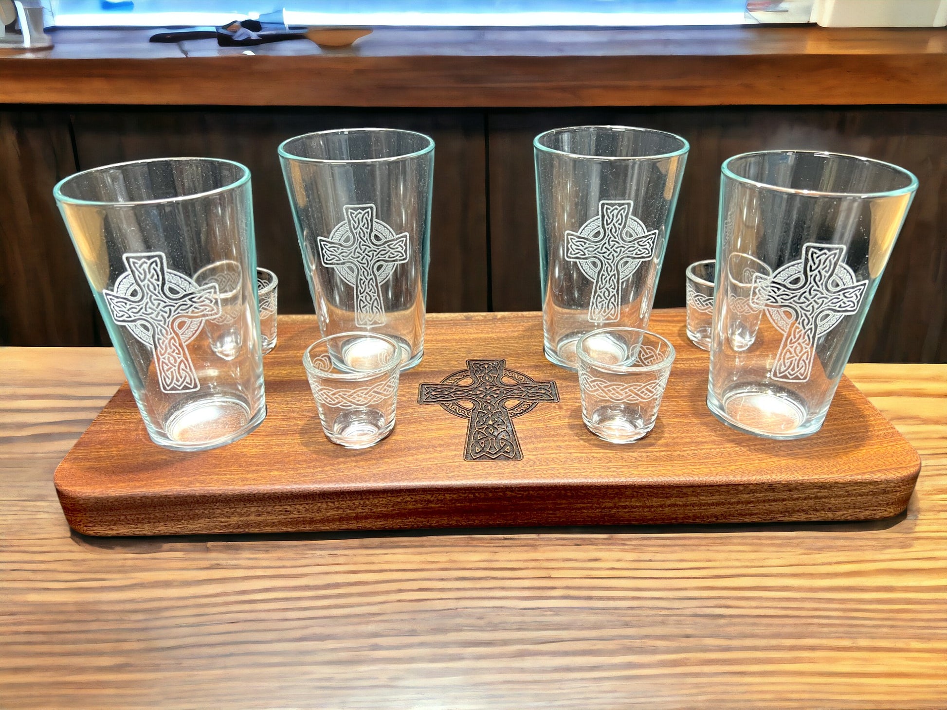 Beer & shot flight made out of solid Makore(African Cherry). Measures 18" x 8" and over 1" thick. This Makore flight features a laser engraved Celtic Cross on the face, 3/4" deep shot glass and beer glass pocket holes and carved handles. The bottom has rubber feet and laser engraved Dublin Drop recipe. Includes (4) pint glasses with Celtic Crosses and (4) shot glasses with Celtic Knot/Rope laser engraved into each. FREE SHIPPING