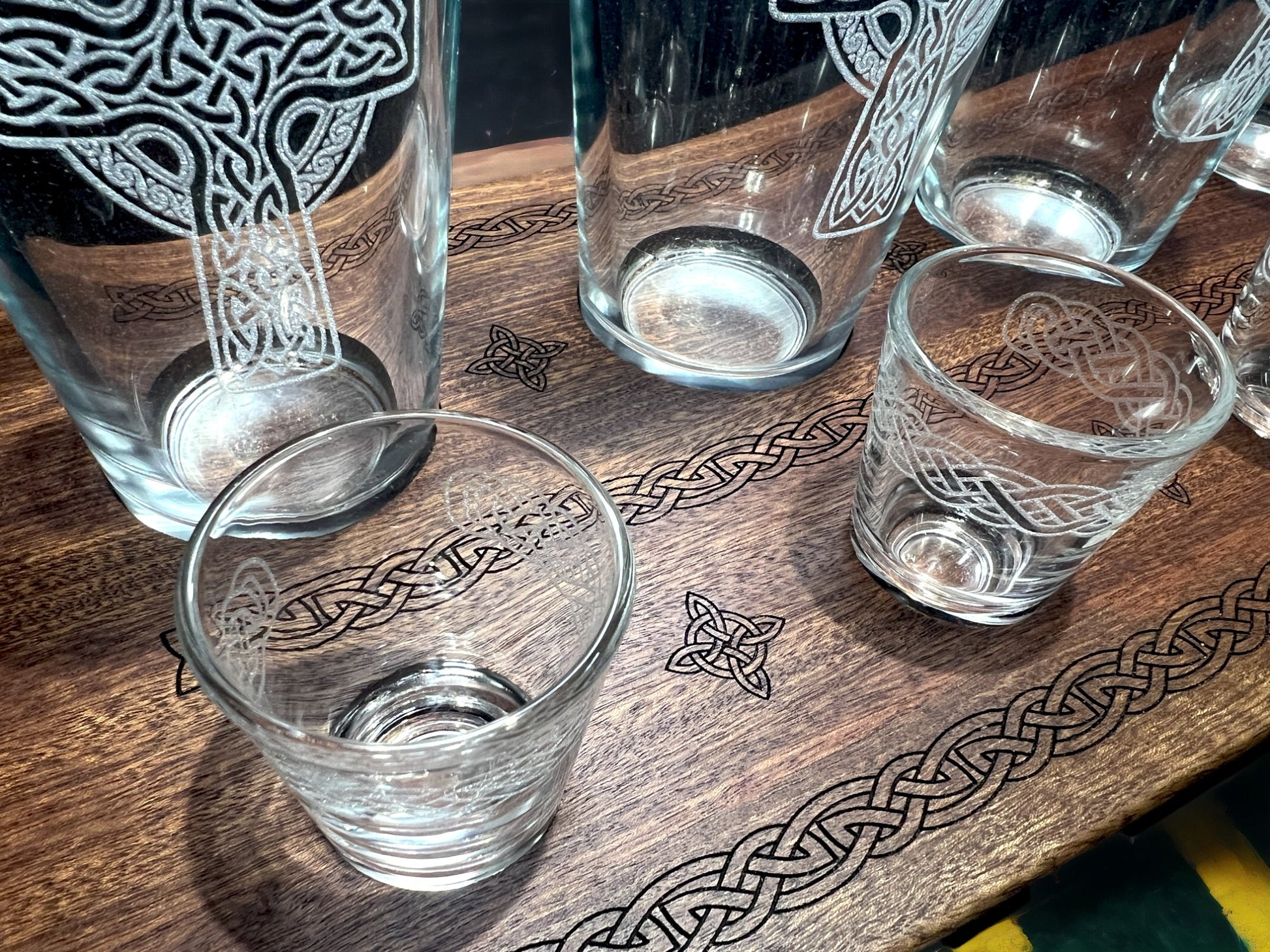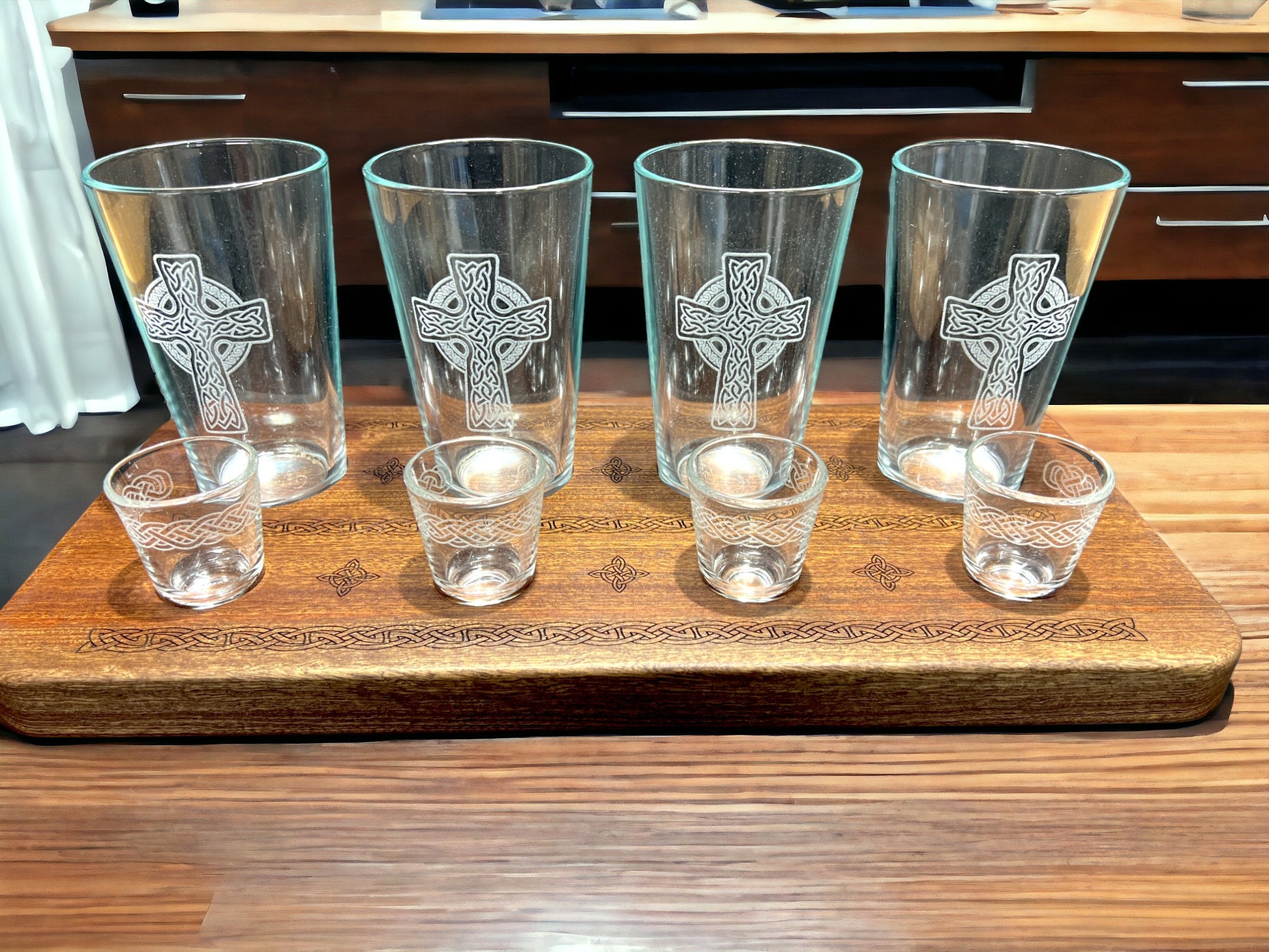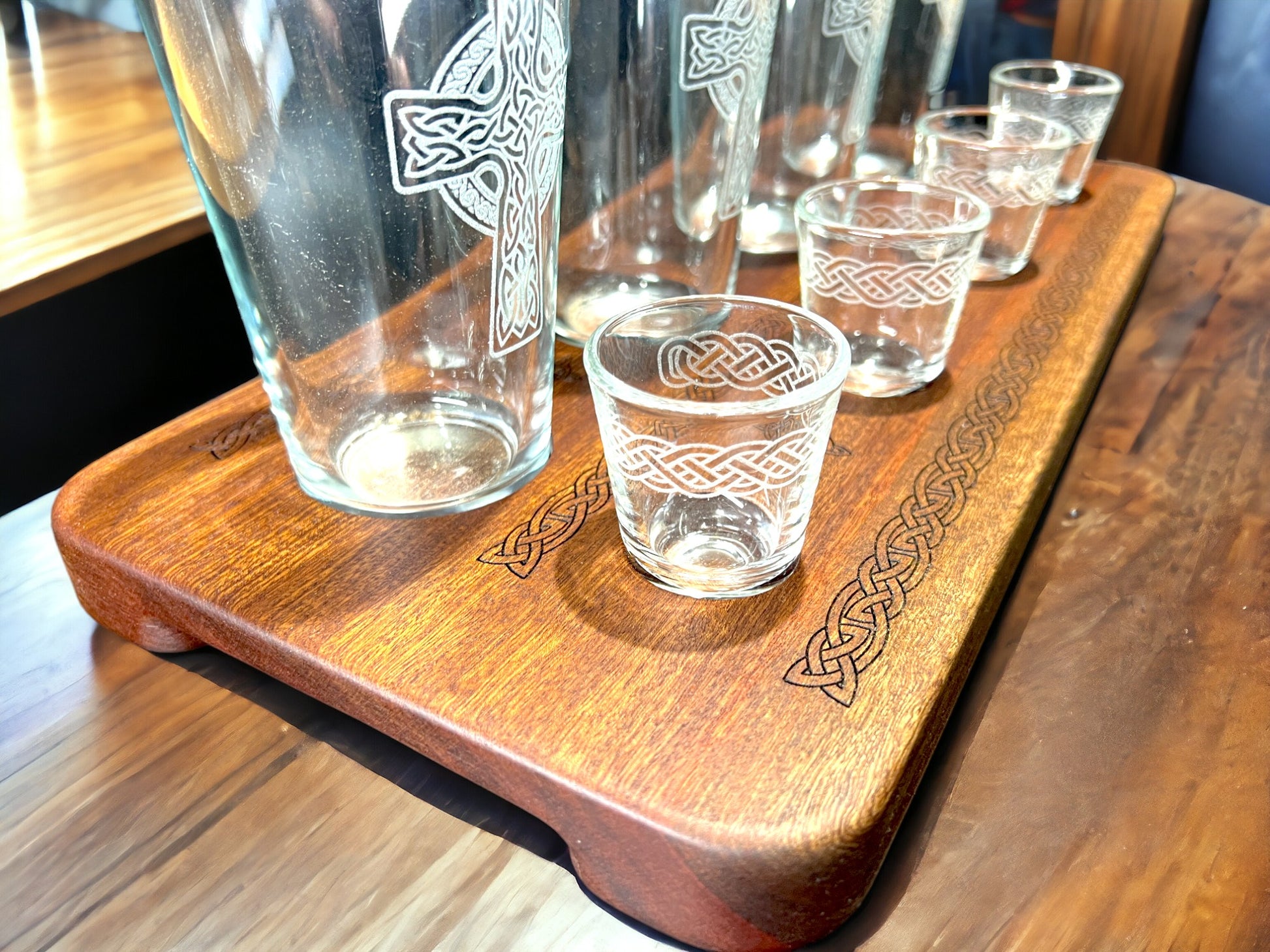 Beer & shot flight made out of solid Makore(African Cherry). Measures 18" x 8" and over 1" thick. This Makore flight features a laser engraved Celtic Knots on the face, 3/4" deep shot glass and beer glass pocket holes and carved handles. The bottom has rubber feet and laser engraved Dublin Drop recipe. Includes (4) pint glasses with Celtic Crosses and (4) shot glasses with Celtic Knot/Rope laser engraved into each. FREE SHIPPING