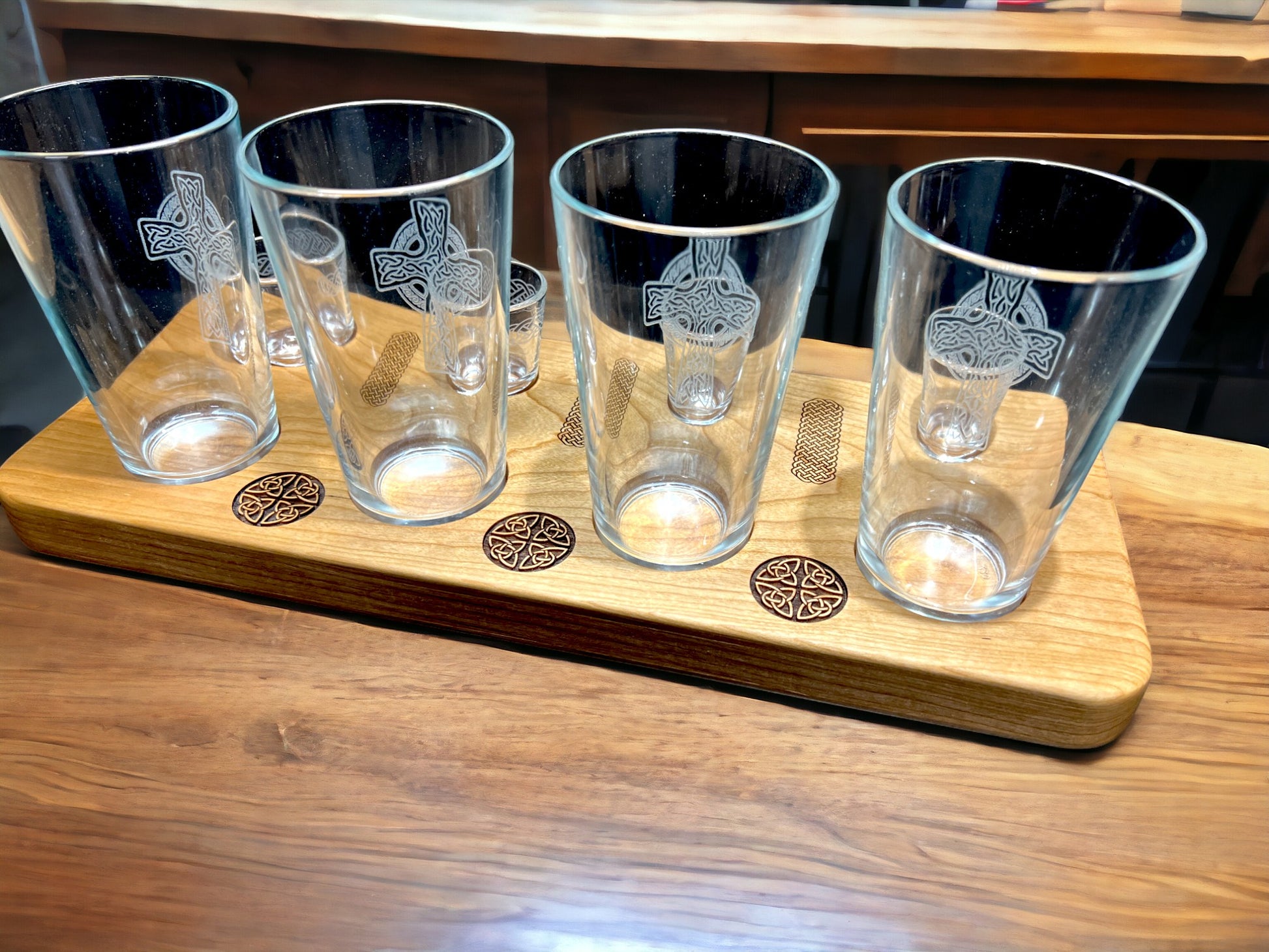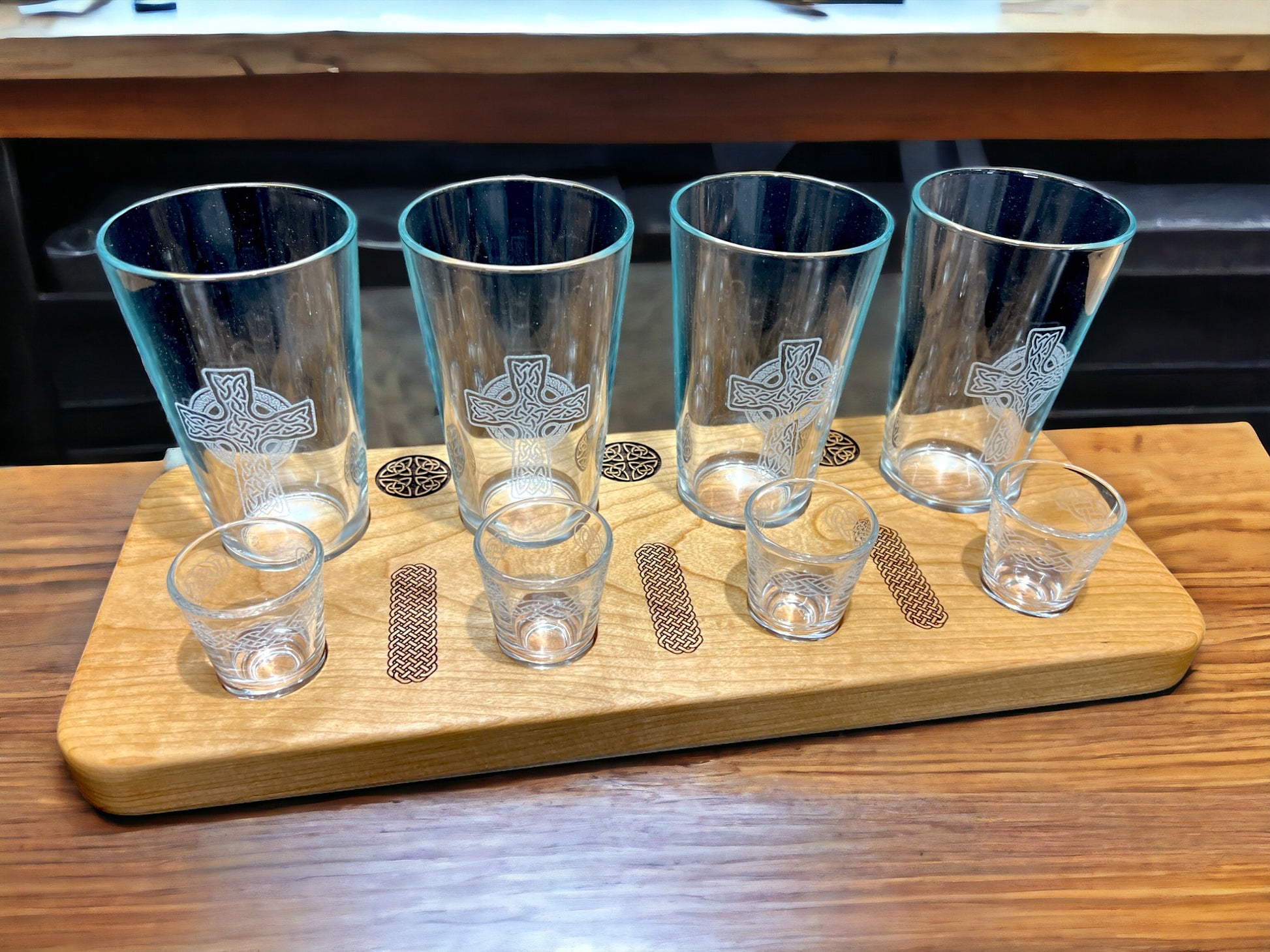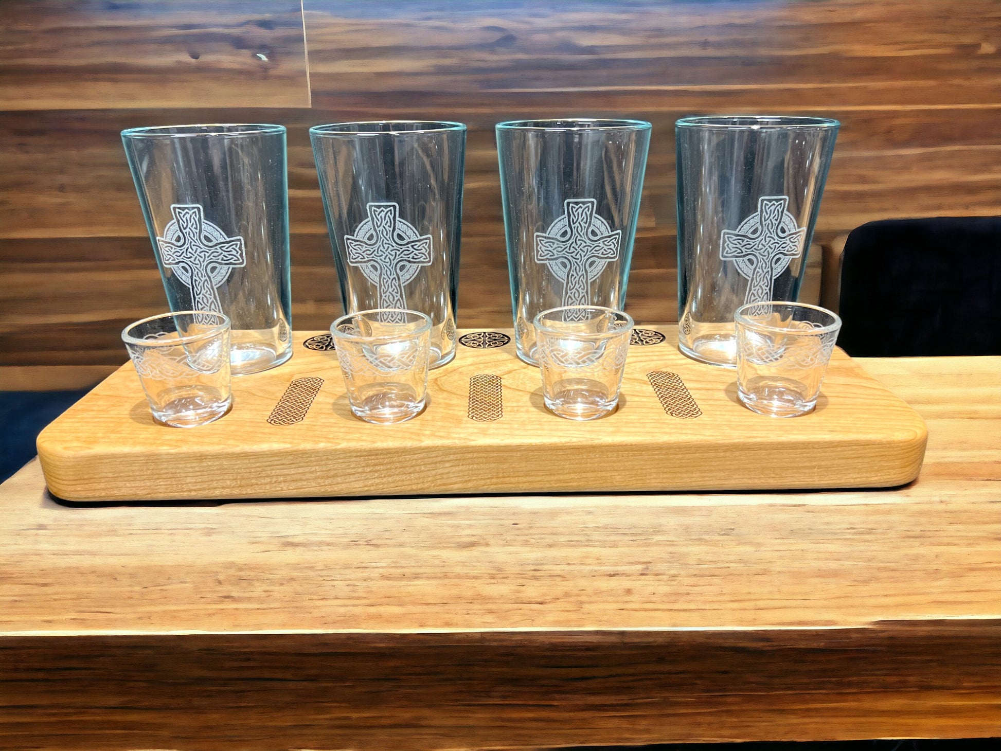 Beer & shot flight made out of solid American Cherry. Measures 18" x 7" and over 1" thick. This cherry flight features a laser engraved Celtic Knots on the face, 3/4" deep shot glass and beer glass pocket holes and carved handles. The bottom has rubber feet and laser engraved Dublin Drop recipe. Includes (4) pint glasses with Celtic Crosses and (4) shot glasses with Celtic Knot/Rope laser engraved into each. FREE SHIPPING