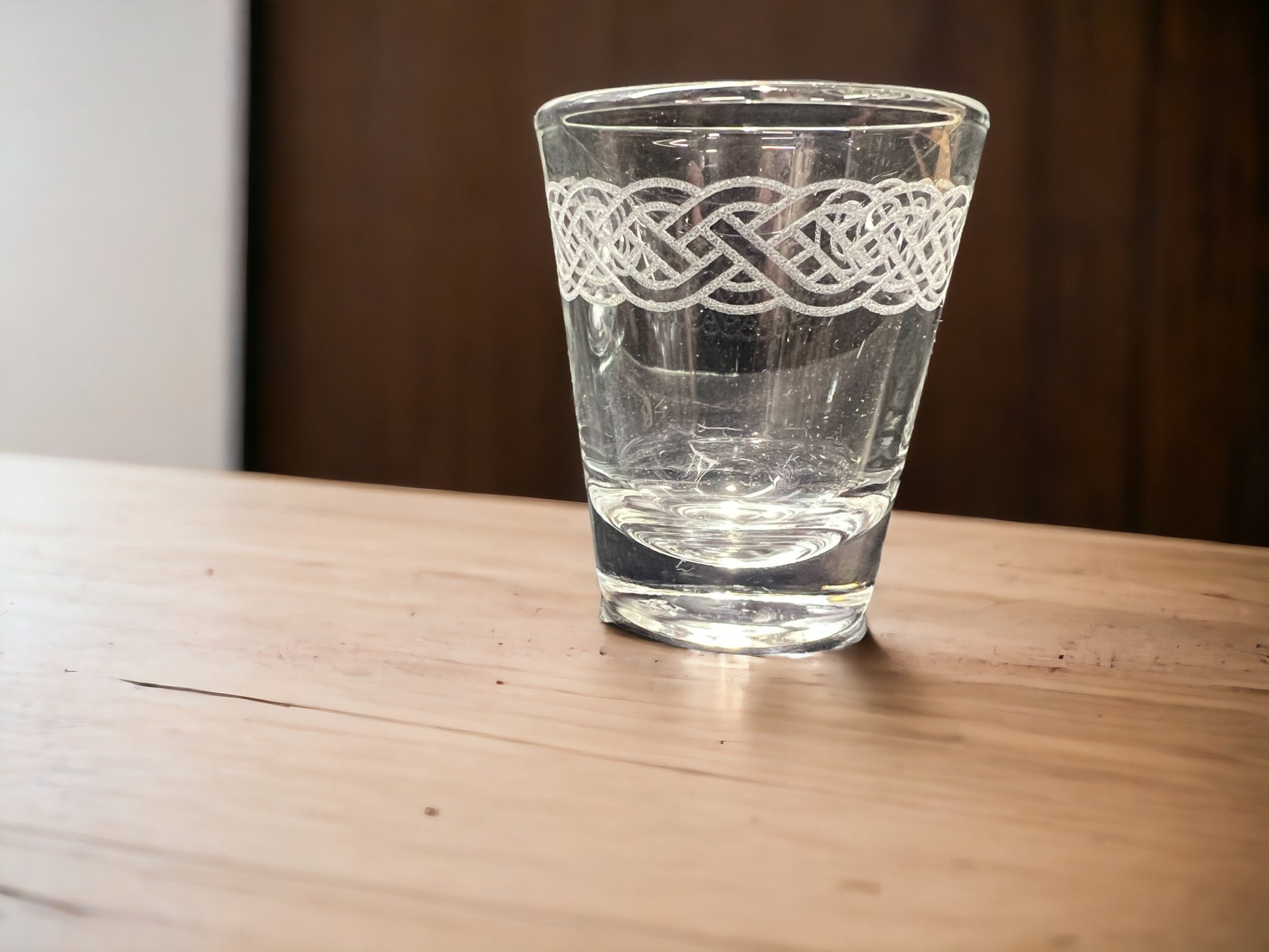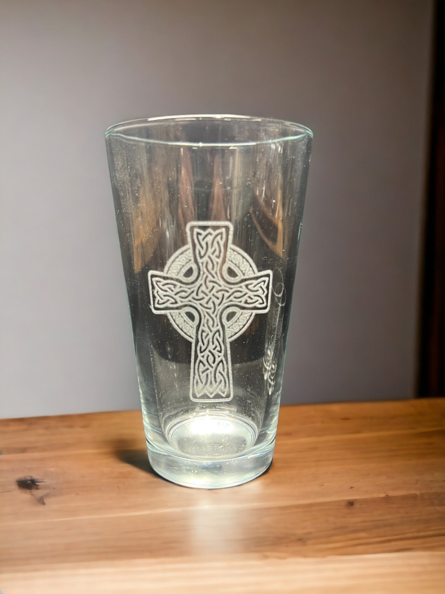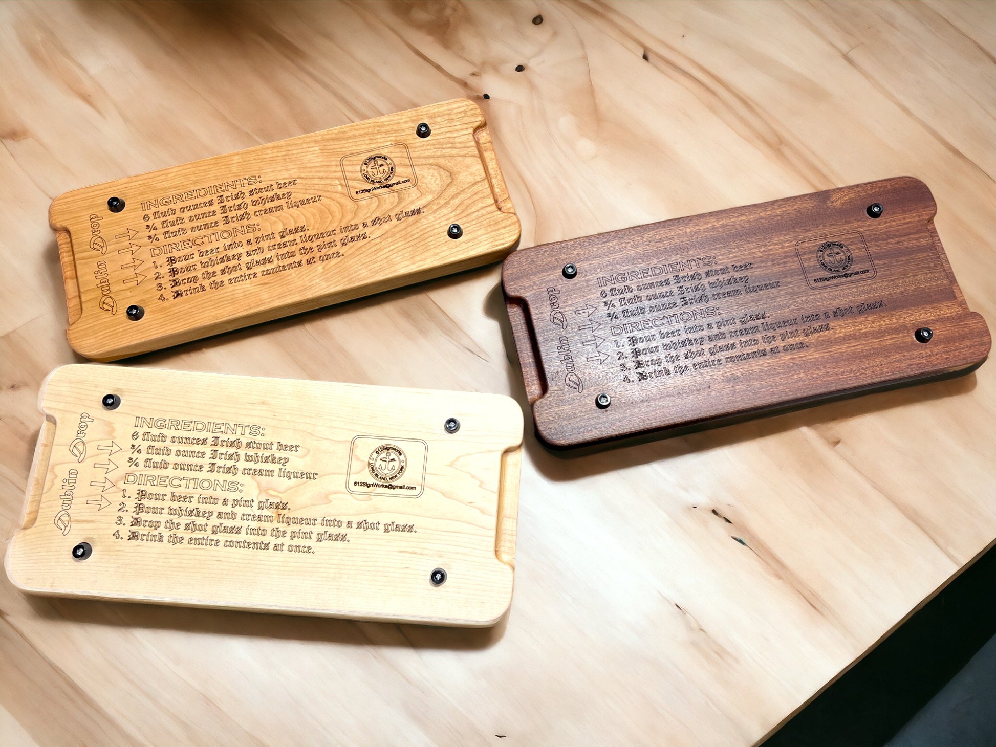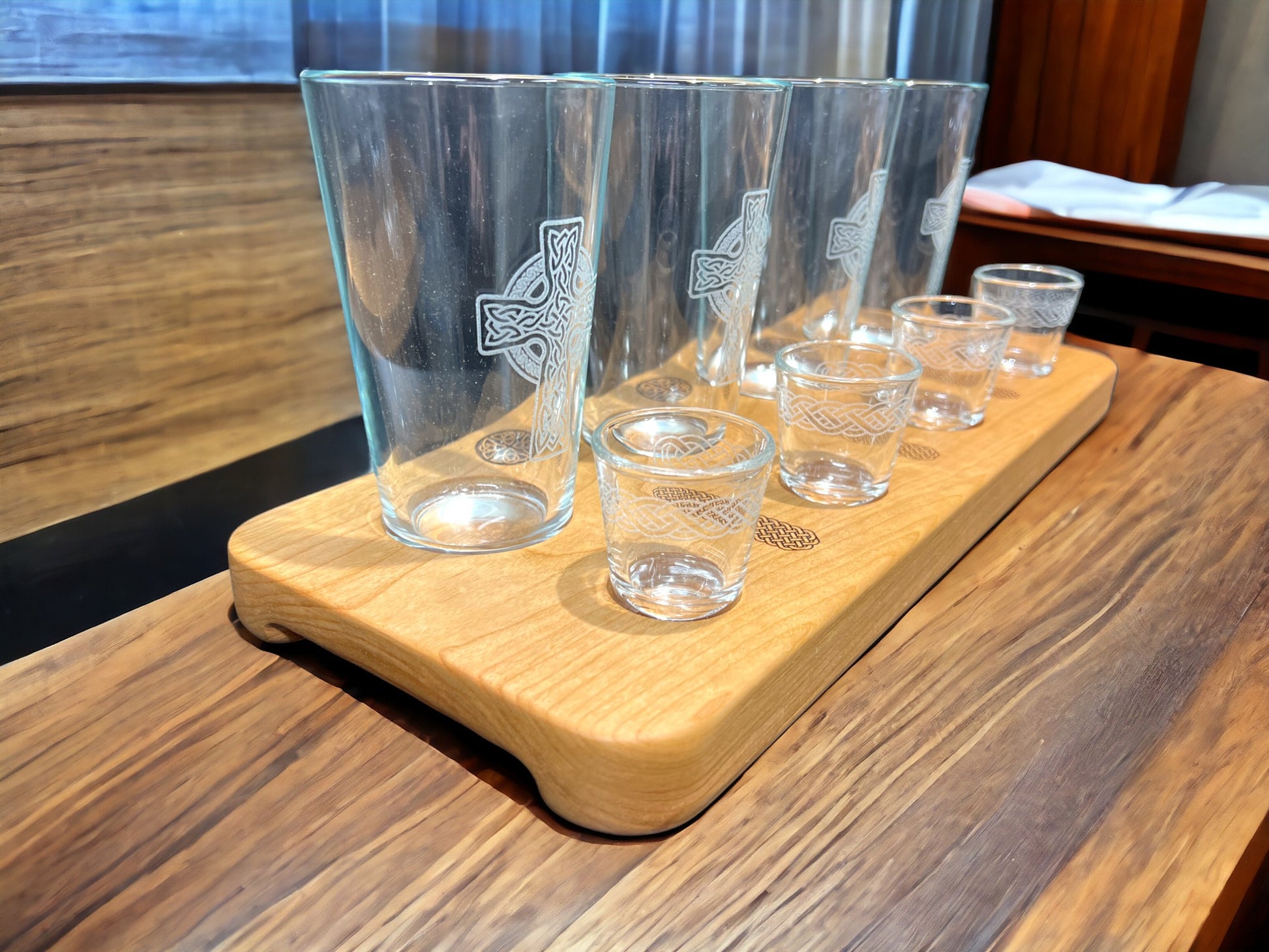 Beer & shot flight made out of solid American Cherry. Measures 18" x 7" and over 1" thick. This cherry flight features a laser engraved Celtic Knots on the face, 3/4" deep shot glass and beer glass pocket holes and carved handles. The bottom has rubber feet and laser engraved Dublin Drop recipe. Includes (4) pint glasses with Celtic Crosses and (4) shot glasses with Celtic Knot/Rope laser engraved into each. FREE SHIPPING