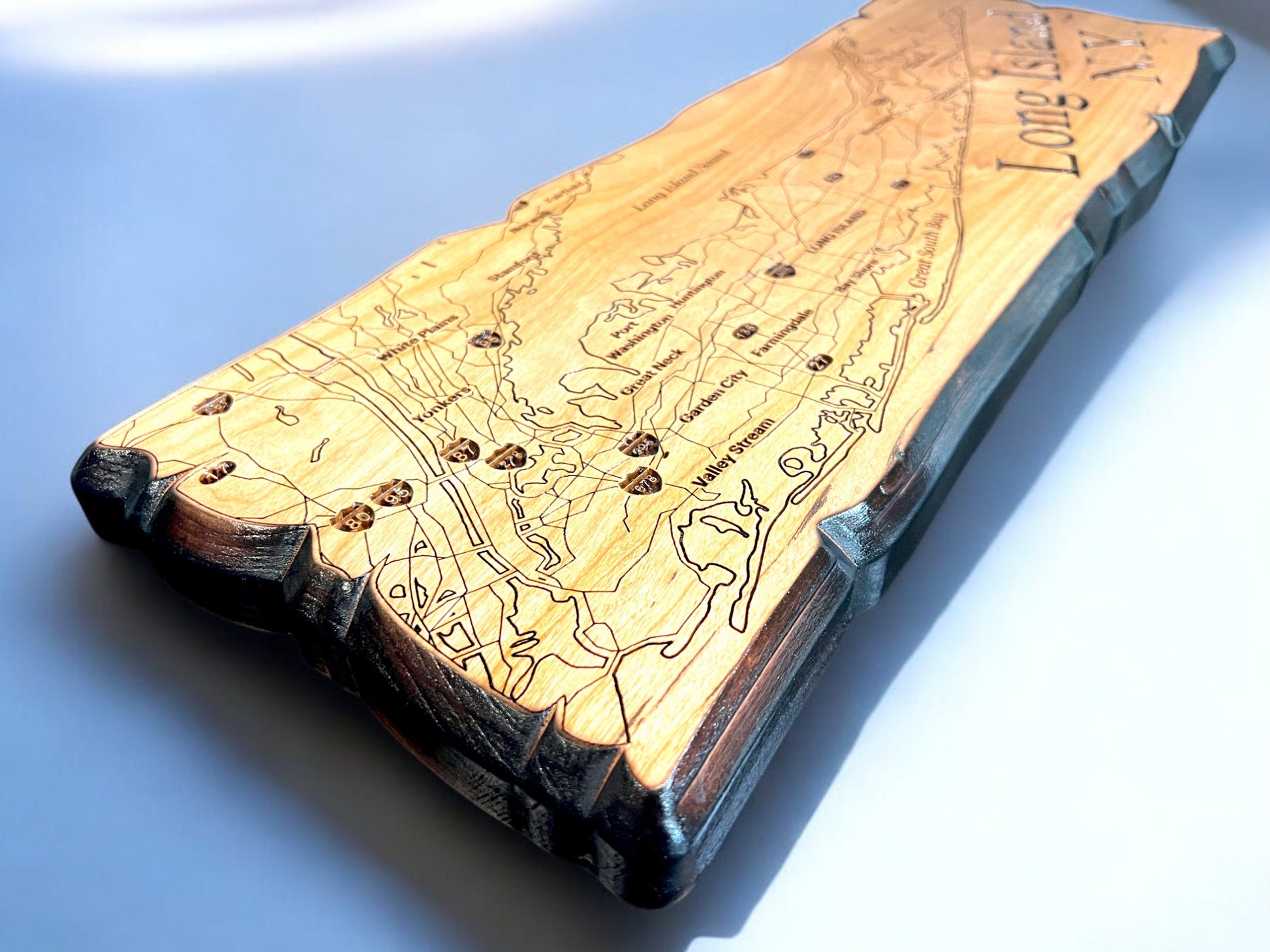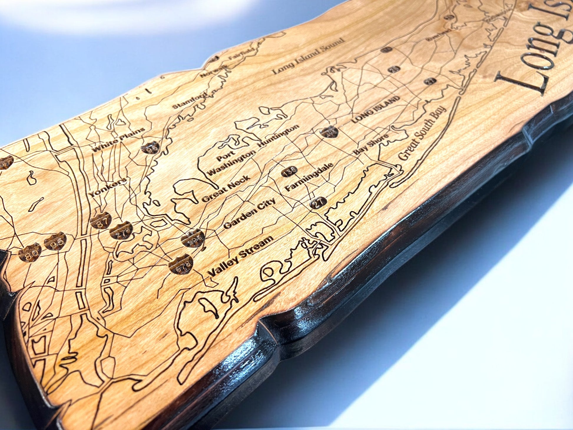1" thick solid cherry wood with laser engraved Long Island map. approximately 22x9 inches