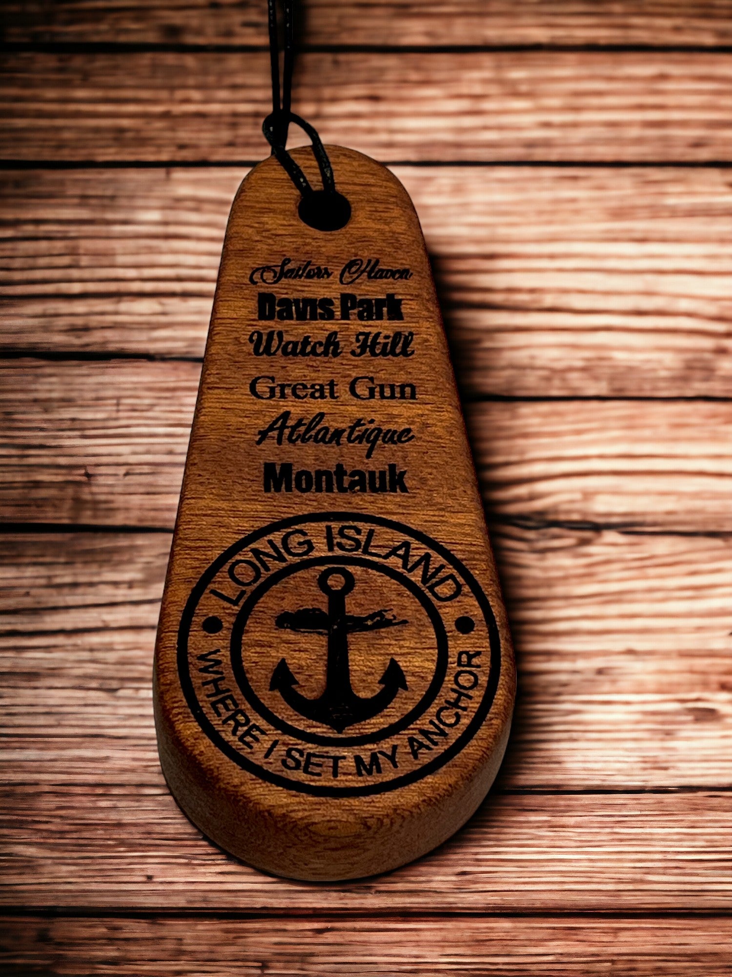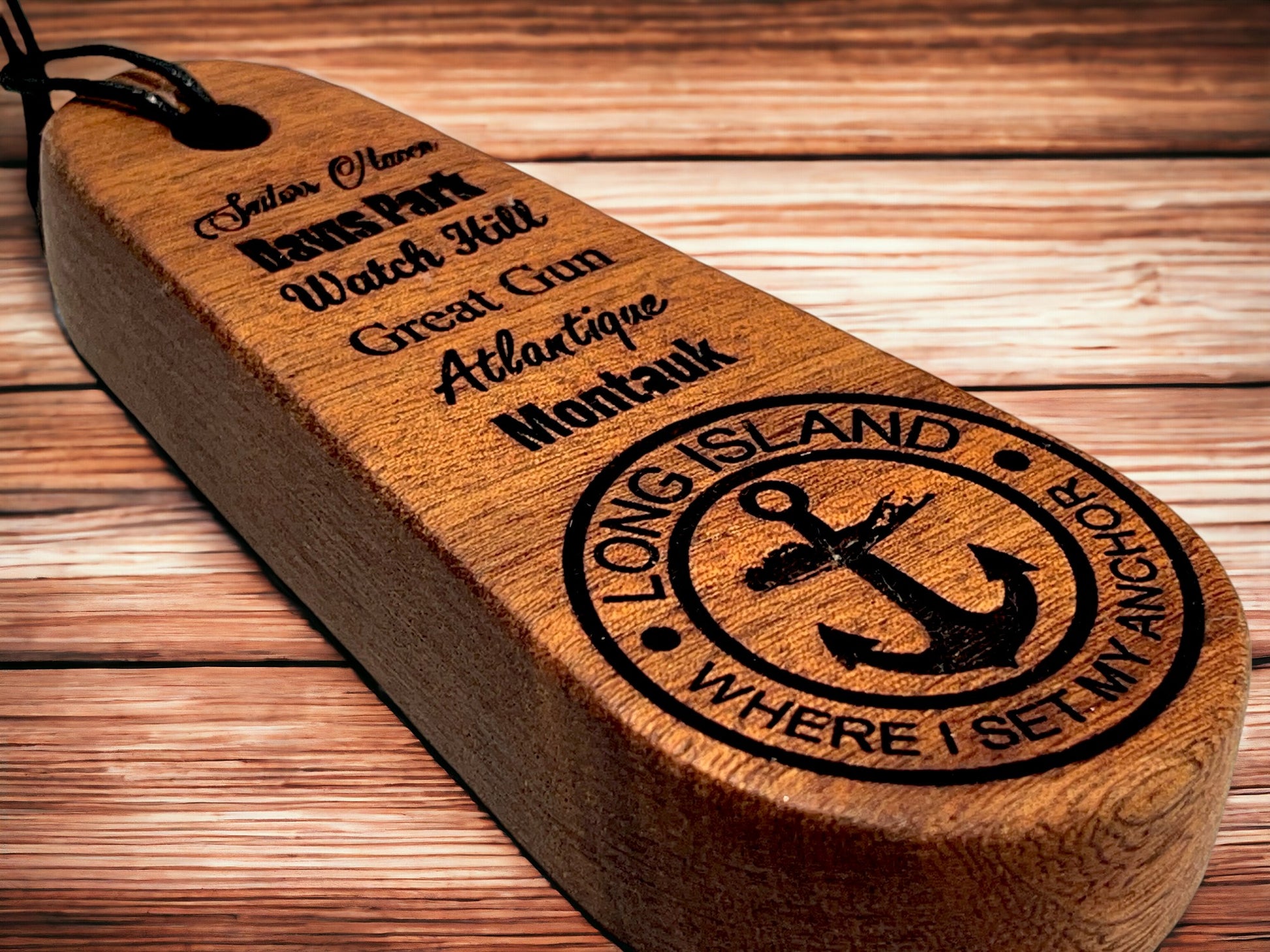 Solid mahogany bottle opener featuring anchorages/marinas on the South Shore of Long Island NY and our signature Long Island Anchor logo. Each bottle opener measures 6" long x 2.5"wide and 1" thick and is made out of solid wood with deep laser engraved text/graphics and a recessed stainless steel insert. Includes waxed rope lanyard. FREE SHIPPING