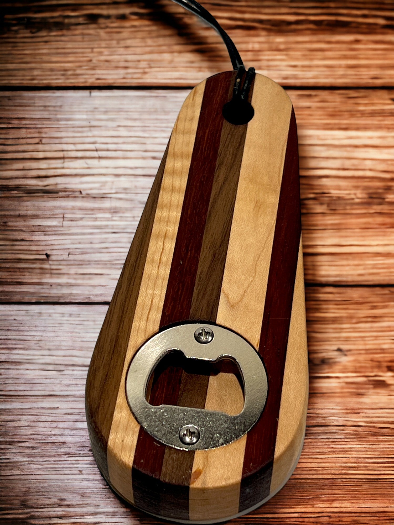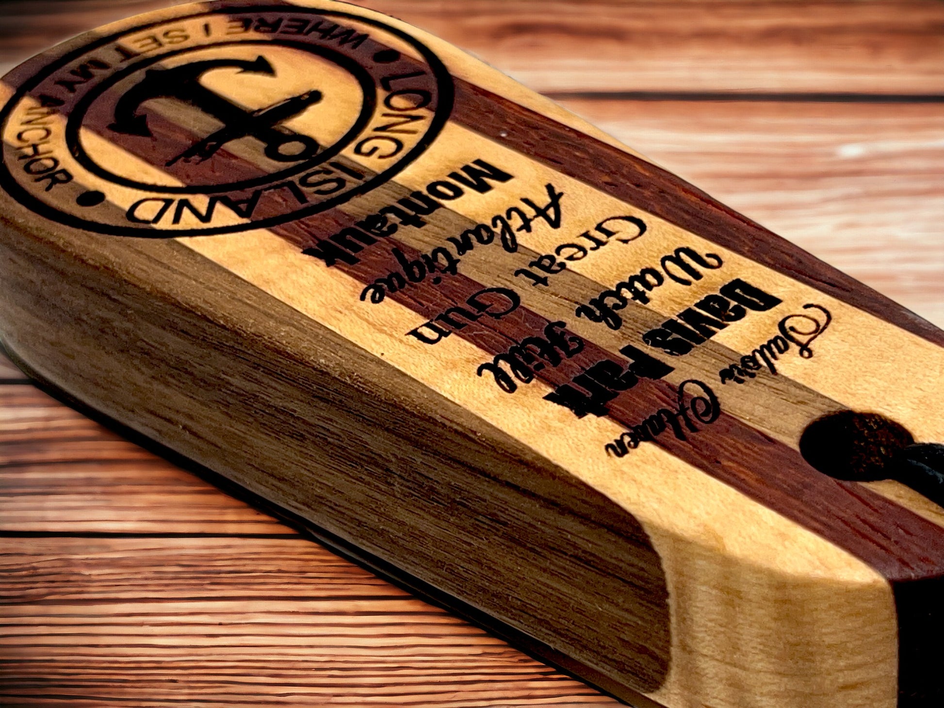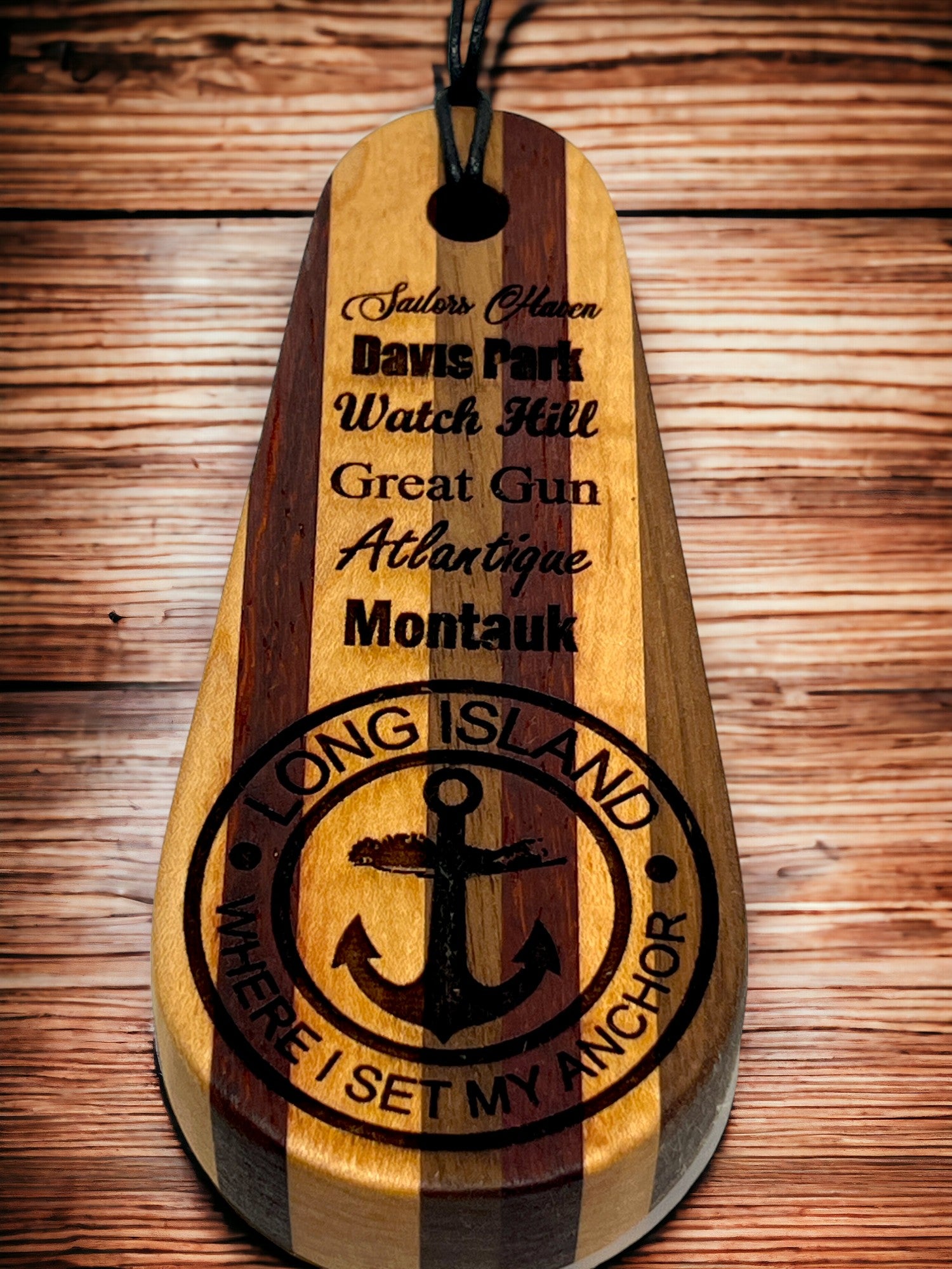 Solid multi wood species bottle opener featuring anchorages/marinas on the South Shore of Long Island NY and our signature Long Island Anchor logo. Each bottle opener measures 6" long x 2.5"wide and 1" thick and is made out of solid wood with deep laser engraved text/graphics and a recessed stainless steel insert. Includes waxed rope lanyard. FREE SHIPPING